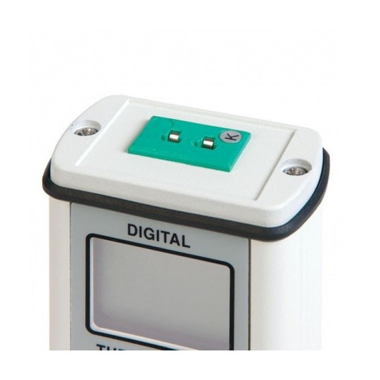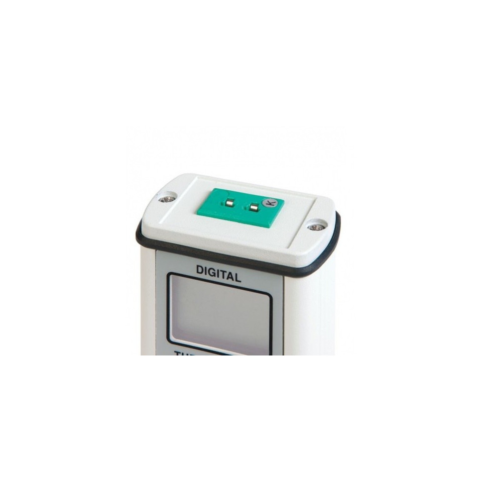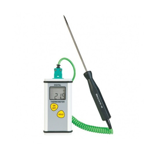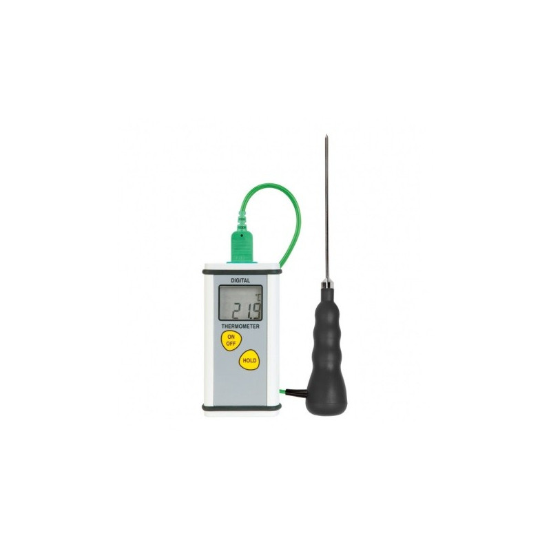 Le thermomètre intègre une fonction d'extinction automatique qui éteint automatiquement l'instrument après 20 minutes, maximisant ainsi la durée de vie de la batterie. Le bouton marche / arrêt est idéalement situé à l'avant de l'instrument, tout comme la fonction de maintien de l'affichage. Le compartiment à piles sécurisé avec un couvercle étanche est situé à la base de l'instrument.