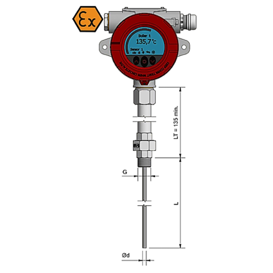 Les capteurs signés ex.jpg II 1 / 2G et ex.jpg II 1 / 2D ont été conçus pour la mesure de température dans toutes les zones d'explosion de gaz, liquides, brouillards et poussières. Dans la zone 0 ou 20 ne peut être qu'un tube de protection. La tête de connexion ne peut être que dans les zones 1 (21) ou 2 (22). La limite entre les zones est le raccord fileté.