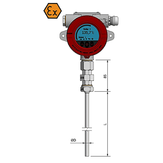 Les capteurs signés ex.jpg II 1 / 2G et ex.jpg II 1 / 2D ont été conçus pour la mesure de température dans toutes les zones d'explosion de gaz, liquides, brouillards et poussières. Dans la zone 0 ou 20 ne peut être qu'un tube de protection. La tête de connexion ne peut être que dans les zones 1 (21) ou 2 (22). La limite entre les zones est le raccord fileté.