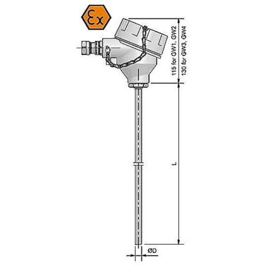 Les capteurs signés ex.jpg II 1 / 2G IIC T6 ÷ T5 Gb et ex.jpg II 1 / 2D Ex ta / tb IIIC TX Da / Db ont été conçus pour la mesure de température dans toutes les zones d'explosion de gaz, liquides, brouillards et poussières. Dans la zone 0 ou 20 ne peut être qu'un tube de protection. La tête de connexion ne peut être que dans les zones 1 (21) ou 2 (22). La limite entre les zones est le raccord fileté.