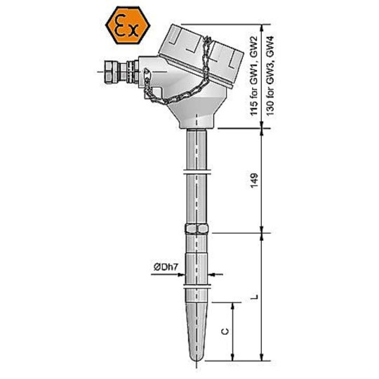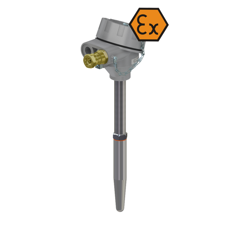 Les capteurs signés ex.jpg II 1 / 2G IIC T6 ÷ T5 Ga / Gb et ex.jpg II 1 / 2D Ex ta / tb IIIC TX Da / Db ont été conçus pour la mesure de température dans toutes les zones d'explosion de gaz, liquides, brouillards et poussières. Dans la zone 0 ou 20 ne peut être qu'un tube de protection. La tête de connexion ne peut être que dans les zones 1 (21) ou 2 (22). La limite entre les zones est le raccord fileté.