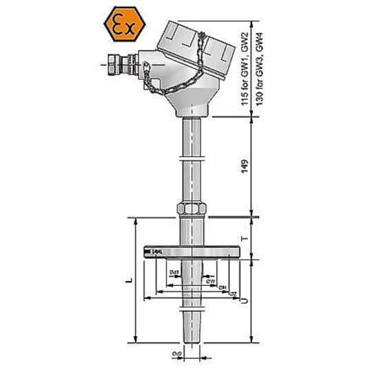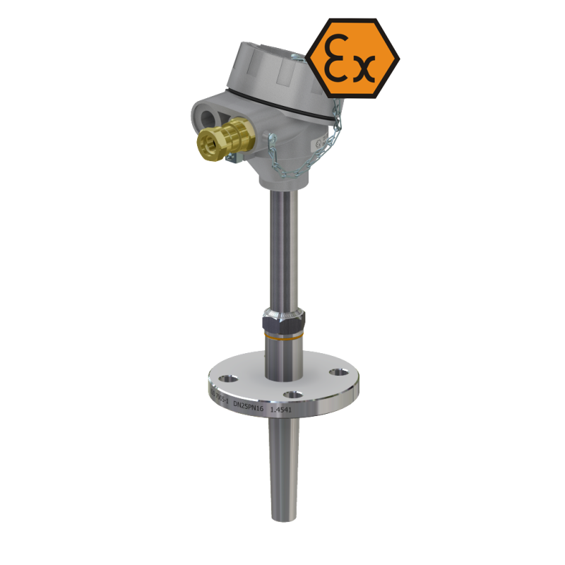 Les capteurs signés ex.jpg II 1 / 2G IIC T6 ÷ T5 Ga / Gb et ex.jpg II 1 / 2D Ex ta / tb IIIC TX Da / Db ont été conçus pour la mesure de température dans toutes les zones d'explosion de gaz, liquides, brouillards et poussières. Dans la zone 0 ou 20 ne peut être qu'un tube de protection. La tête de connexion ne peut être que dans les zones 1 (21) ou 2 (22). La limite entre les zones est le raccord fileté.